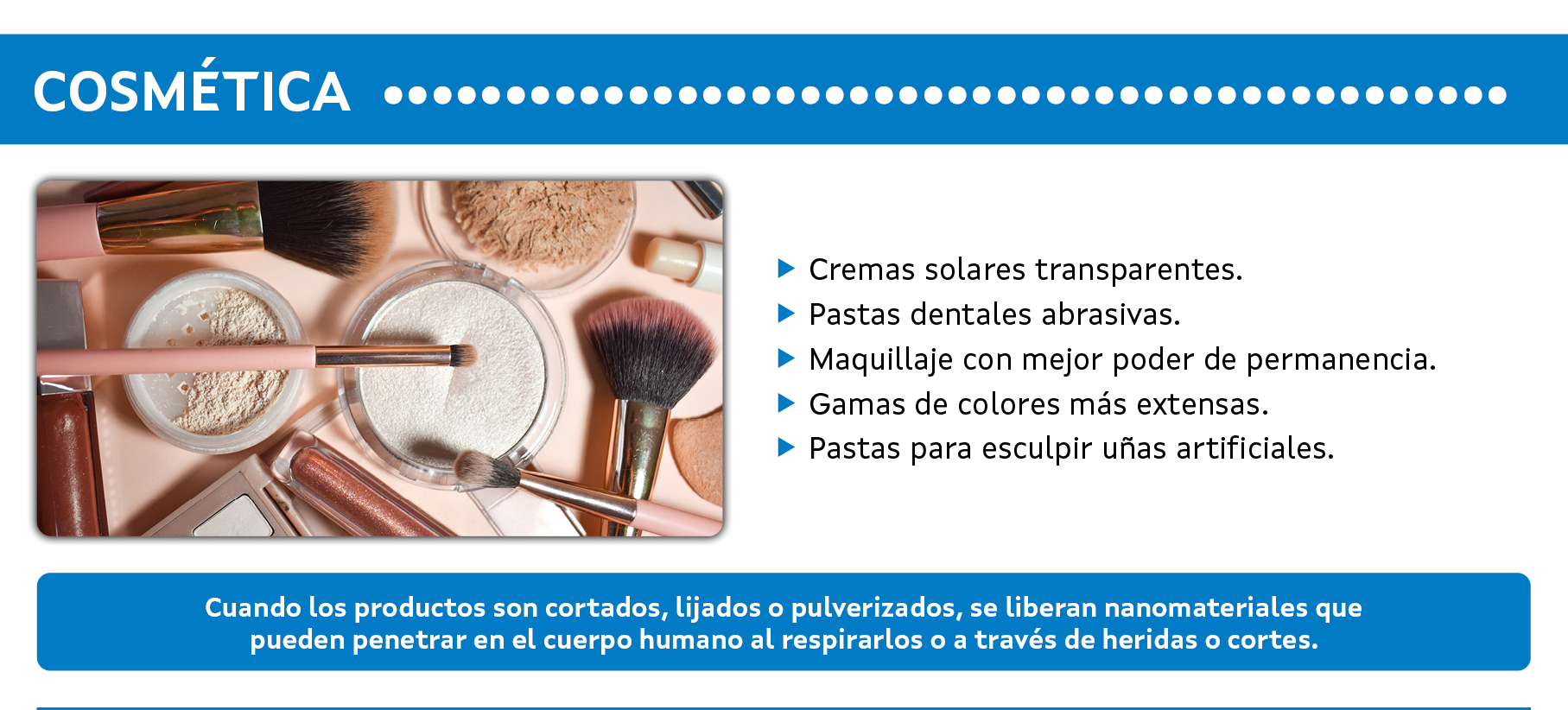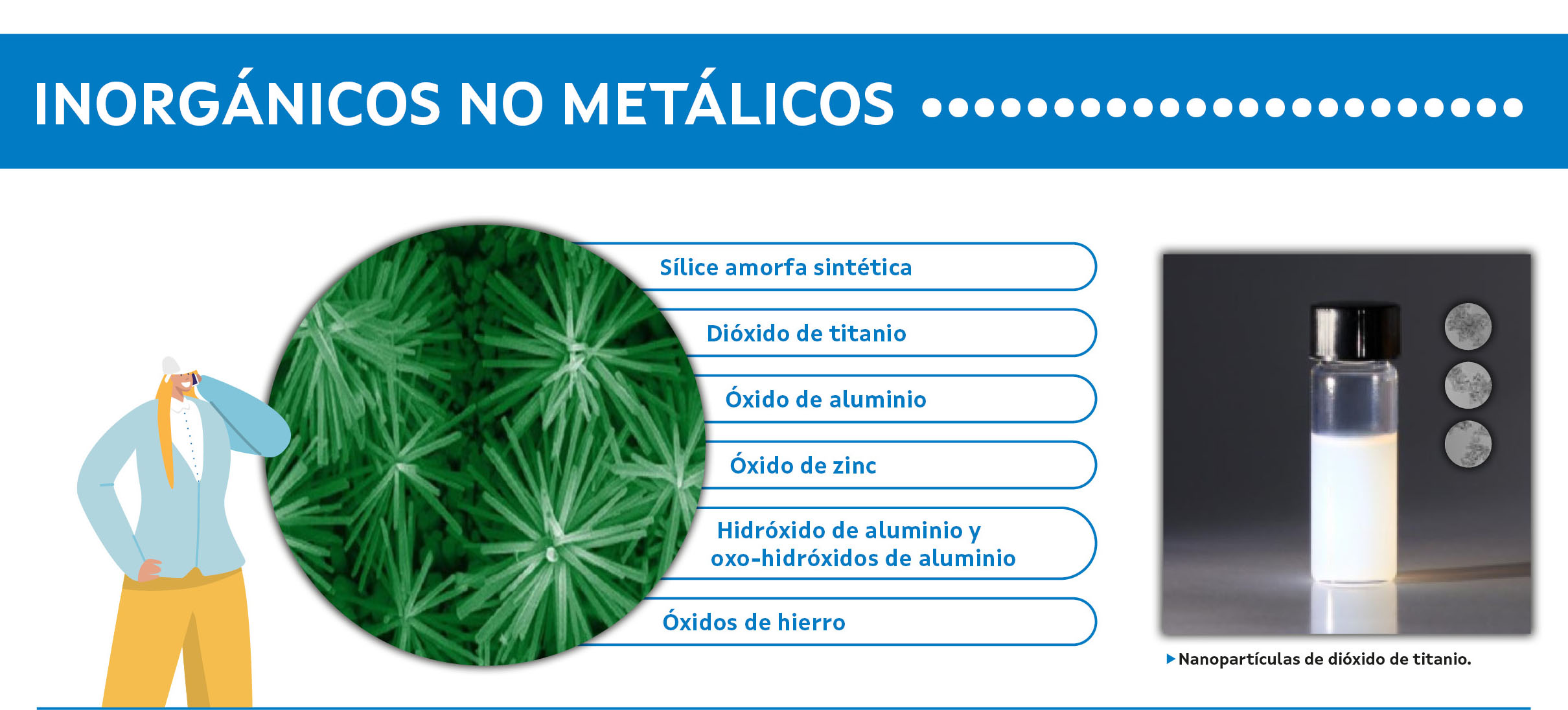 | Dióxido de titanio (TiO2) | Cremas solares, revestimientos para plásticos y metales y productos autolimpiables, por sus propiedades fotocatalíticas, antimicrobianas y de protección frente a rayos UV. |