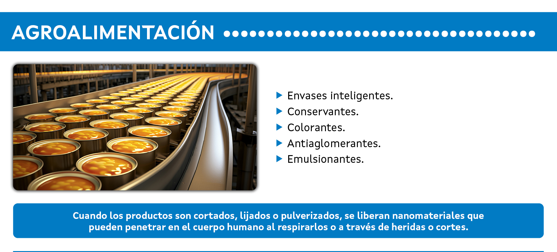 Las nuevas propiedades de los nanomateriales pueden ser explotadas en todas las áreas de actividad económica, desde la ganadería o minería hasta el sector aeroespacial, pasando por la industria, la construcción, la telefonía inteligente, el internet de las cosas, la automoción, el textil, los cosméticos, los fármacos o la industria agroalimentaria.