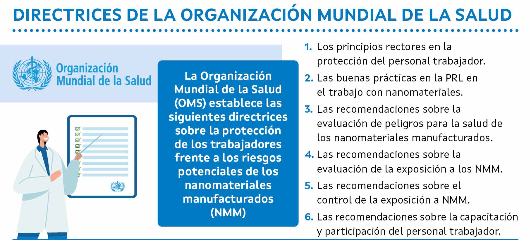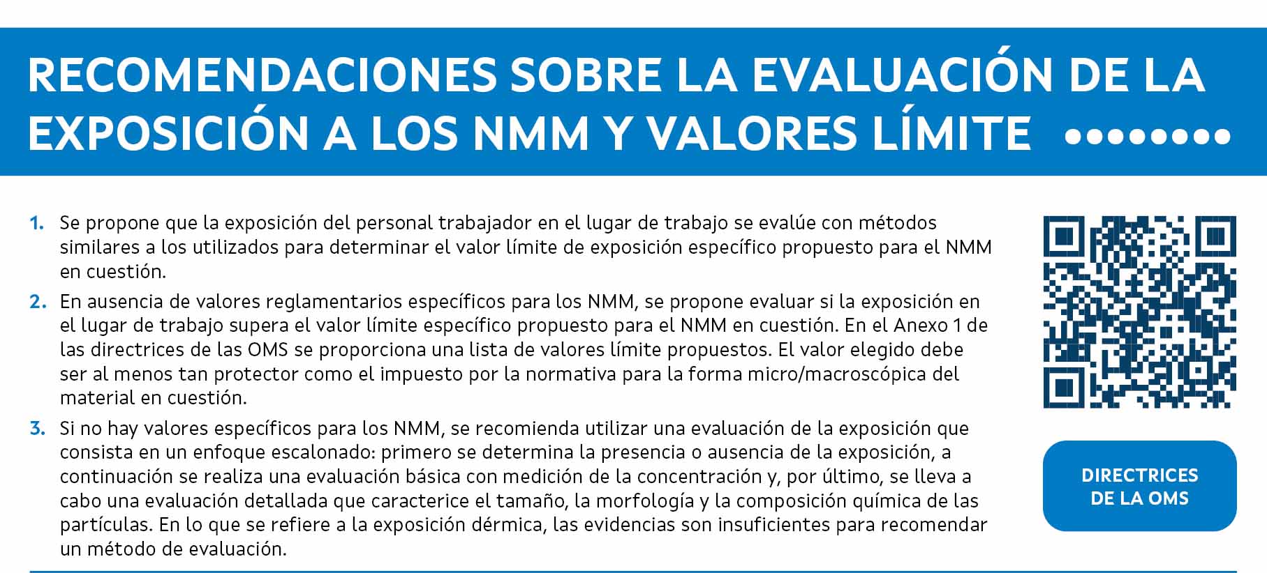 5. En ausencia de valores reglamentarios específicos para los NMM, el GED propone evaluar si la exposición en el lugar de trabajo supera el valor límite específico propuesto para el NMM en cuestión. En el Anexo 1 de las directrices de las OMS se proporciona una lista de valores límite propuestos. El valor elegido debe ser al menos tan protector como el impuesto por la normativa para la forma micro/ macroscópica del material en cuestión.