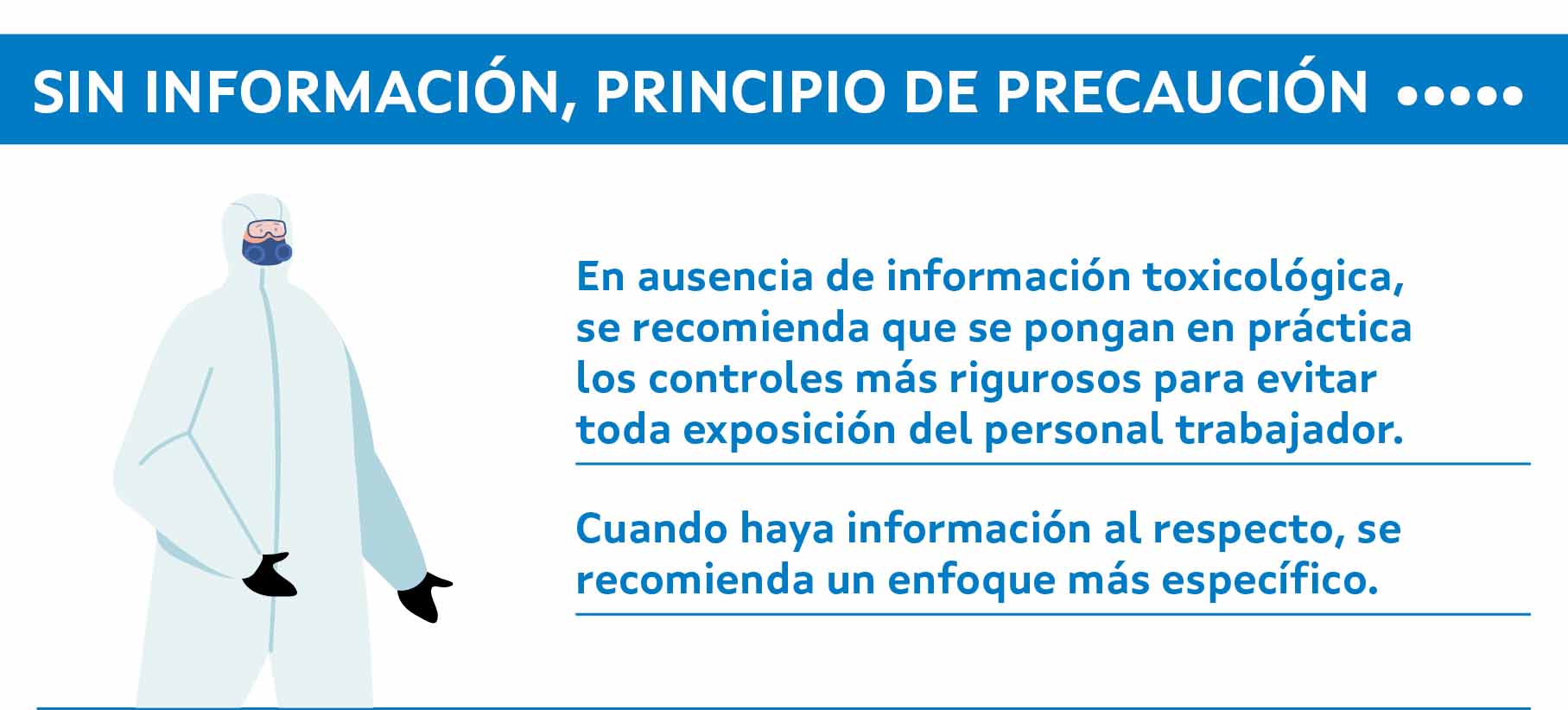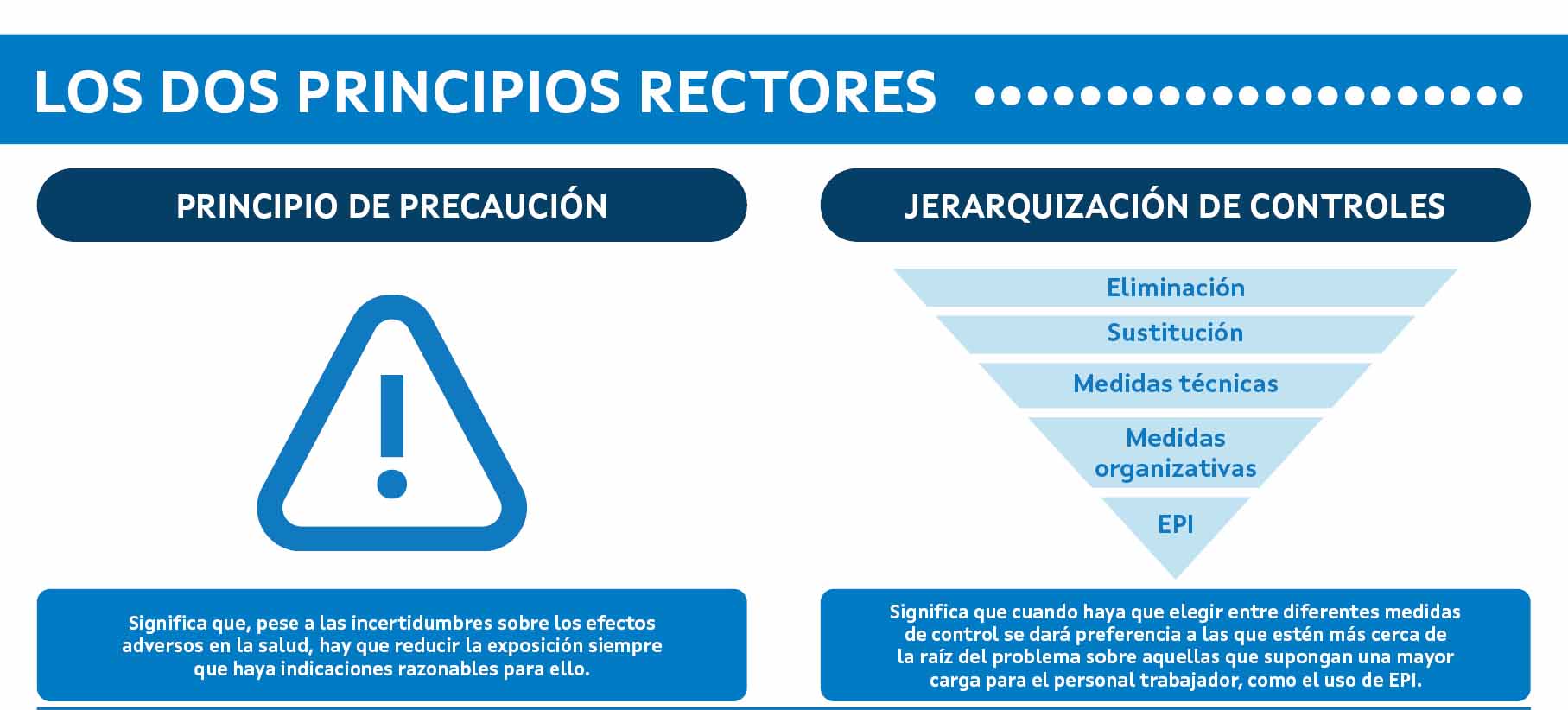 Otro principio rector importante fue la jerarquización en el control de la exposición. Esto significa que cuando haya que elegir entre diferentes medidas de control se dará preferencia a las que estén más cerca del origen del problema sobre aquellas que supongan una mayor carga para el personal trabajador, como el uso de equipos de protección individual.