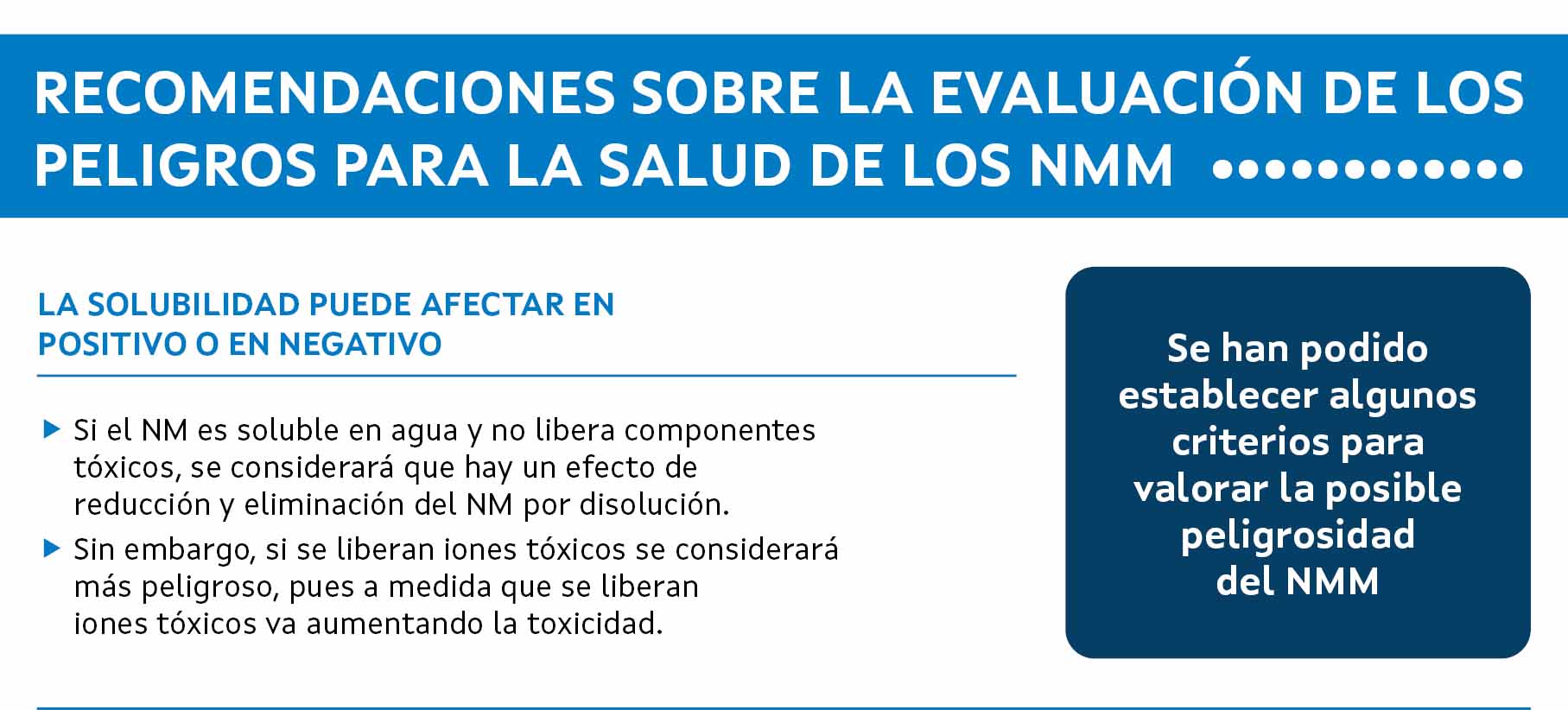 Si el NM es soluble en agua y no libera componentes tóxicos, se considerará que hay un efecto de reducción y eliminación del NM por disolución. Sin embargo, si se liberan iones tóxicos se considerará que una mayor solubilidad, aumenta la toxicidad del NM.