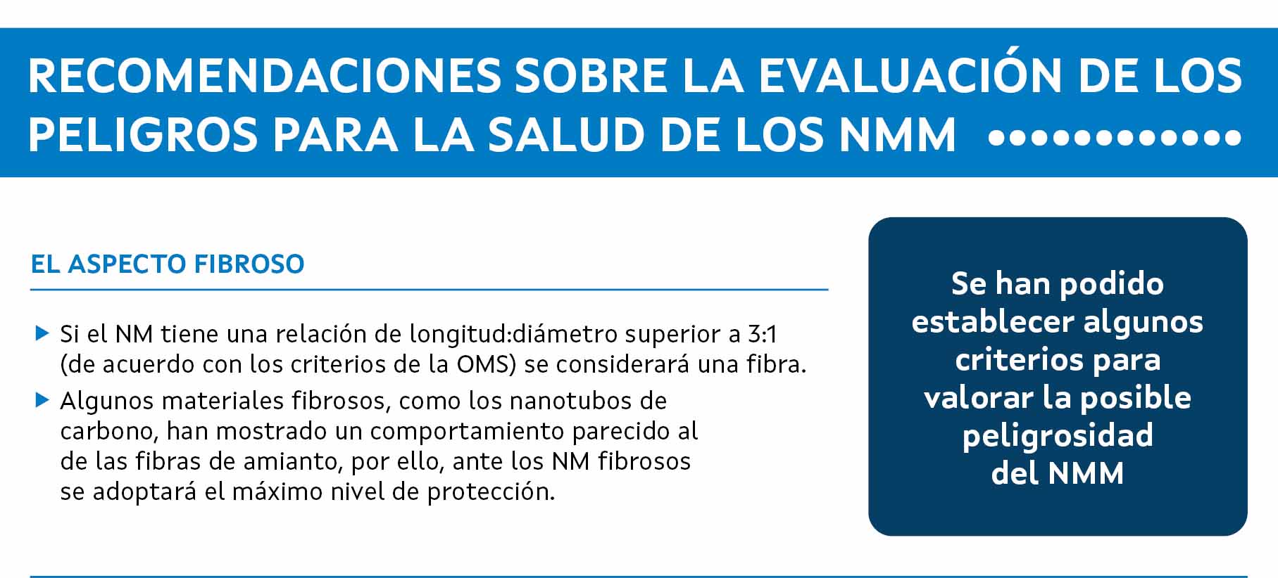 Si el NM tiene un aspecto fibroso (relación longitud/anchura superior 3:1, de acuerdo con los criterios de la OMS), como los nanotubos de carbono, puede presentar un comportamiento parecido al de las fibras de amianto, por ello, ante los NM fibrosos, se adoptará el máximo nivel de protección.