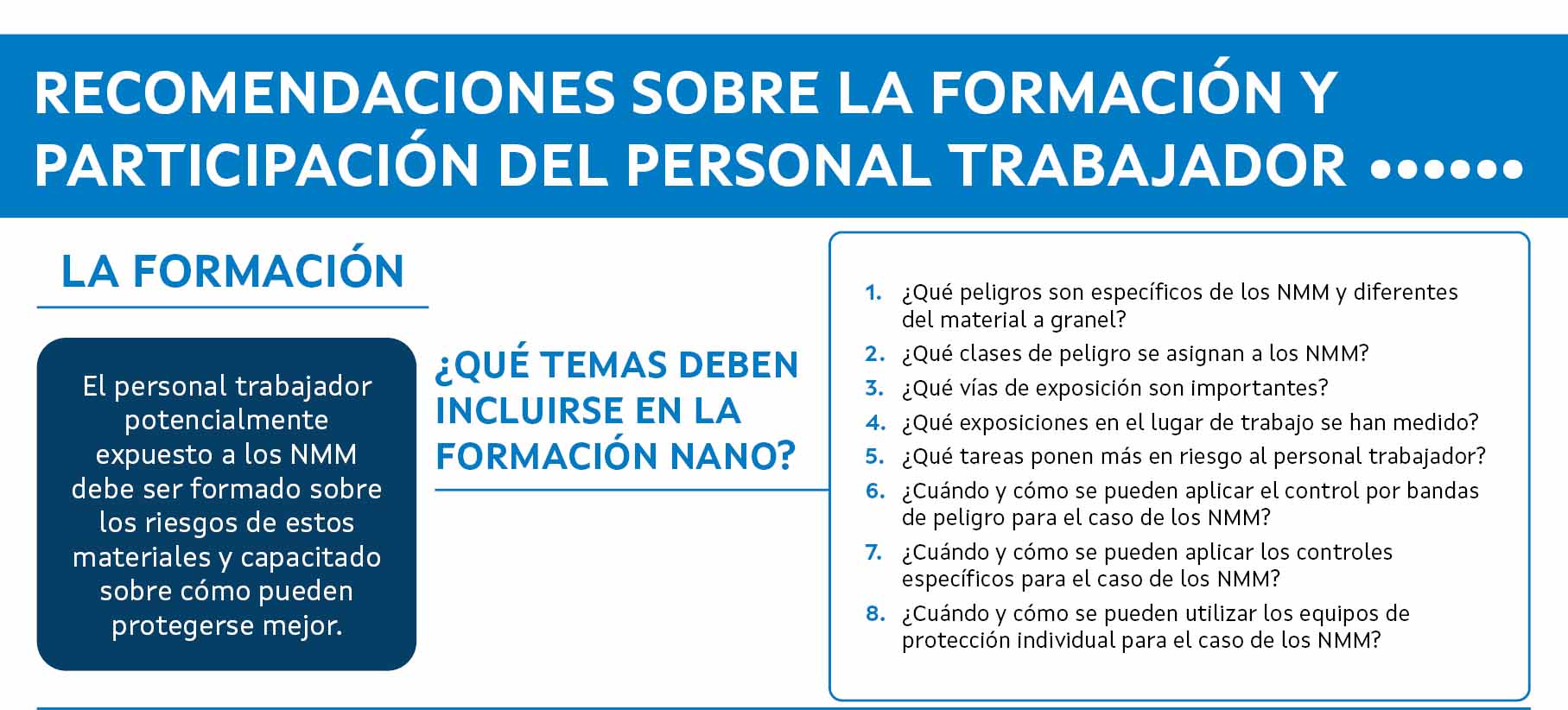 Formar y capacitar al personal trabajador sobre los problemas de salud y seguridad específicos de los NMM.