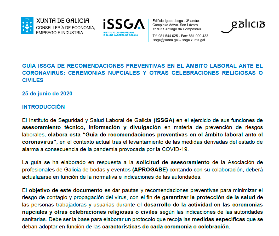 Guía Issga de recomendacións preventivas no ámbito laboral ante o coronavirus: cerimonias nupciais…