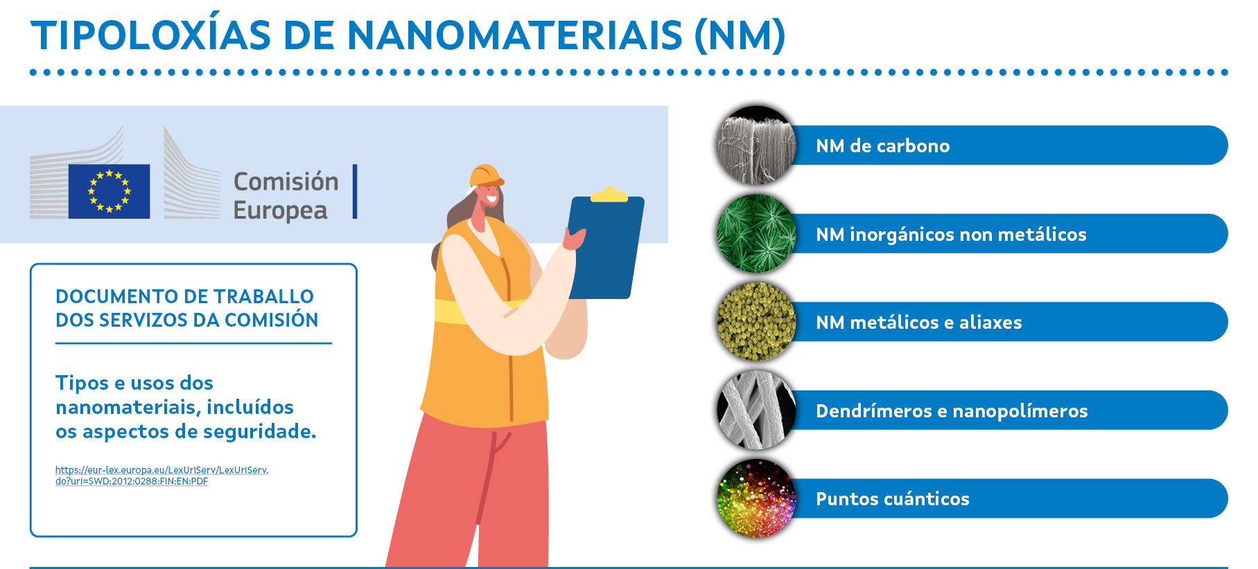 A Unión Europea identifica cinco grandes grupos de nanomateriais que actualmente se están utilizando no mercado: de carbono, inorgánicos non metálicos, metálicos e aliaxes, dendrímeros/nanopolímeros e pingas cuánticas.