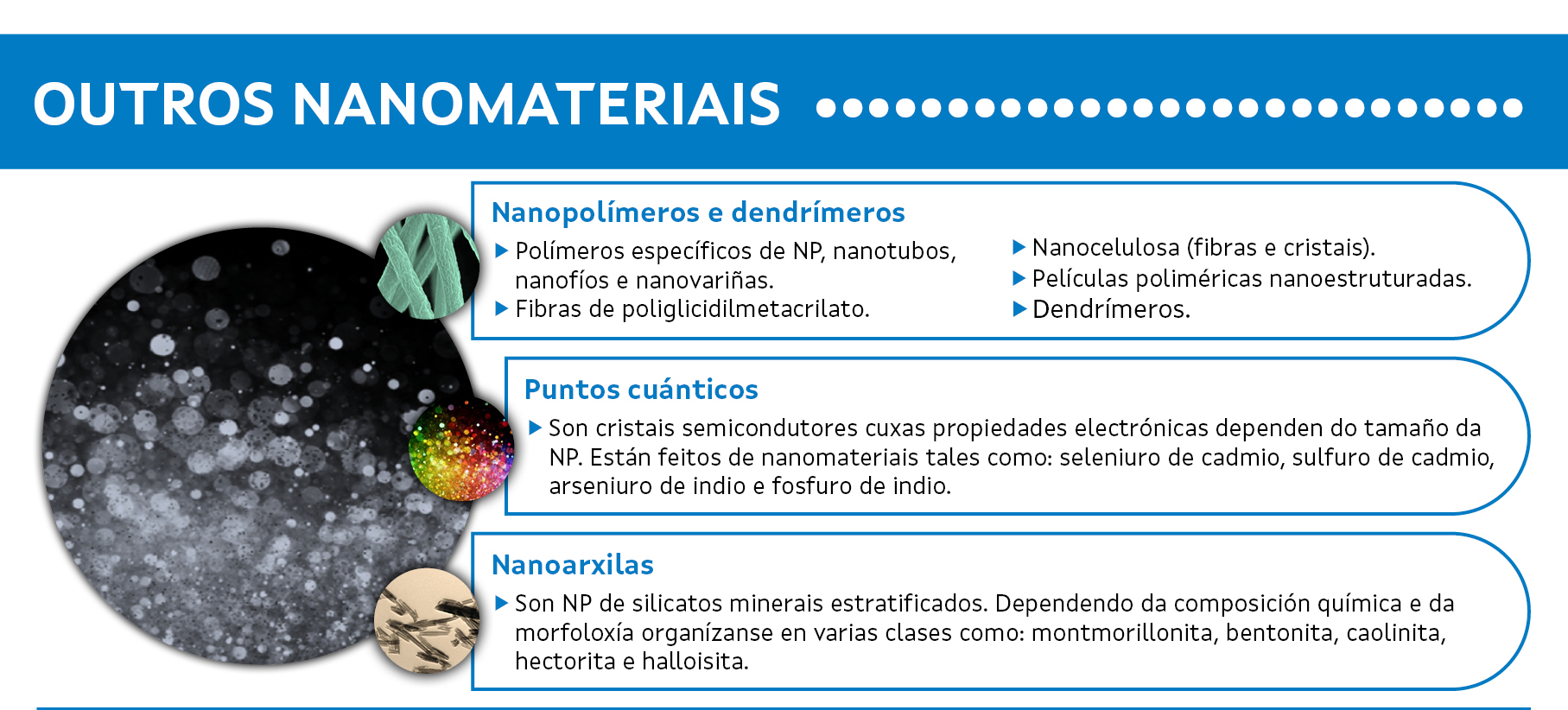 | Nanomaterial | Exemplos de aplicacións en distintos sectores |