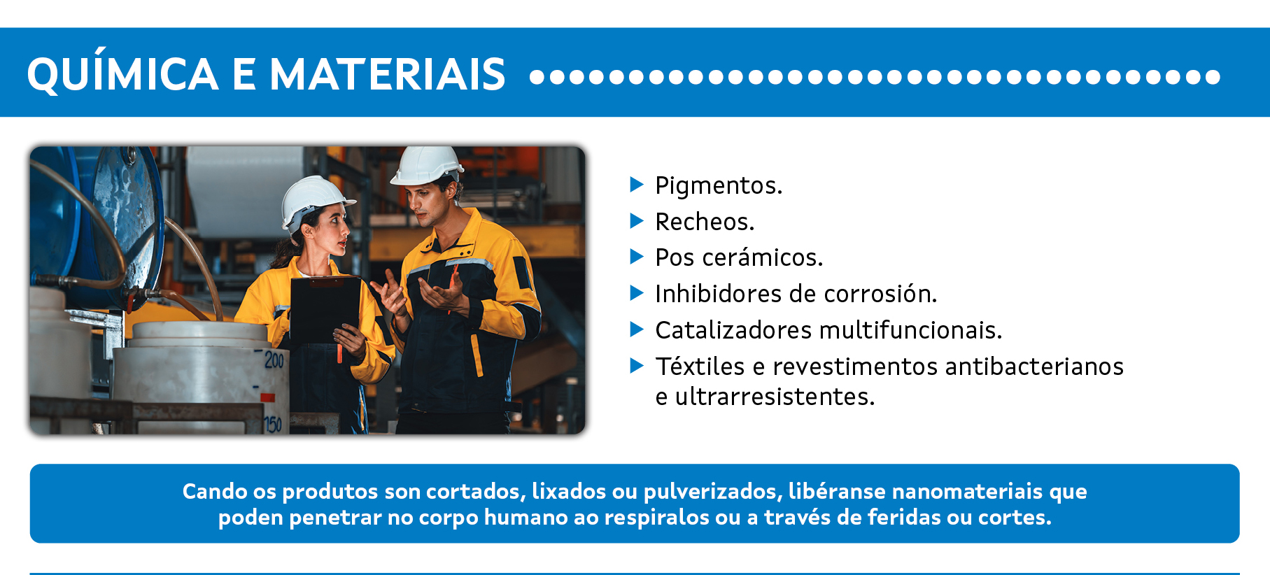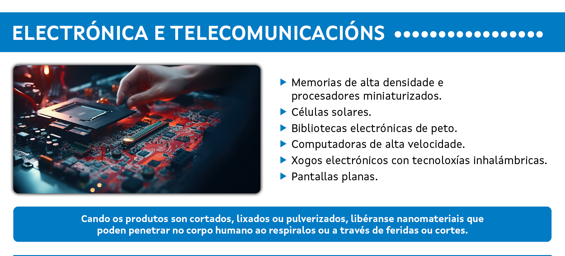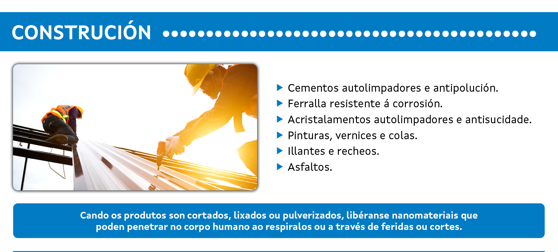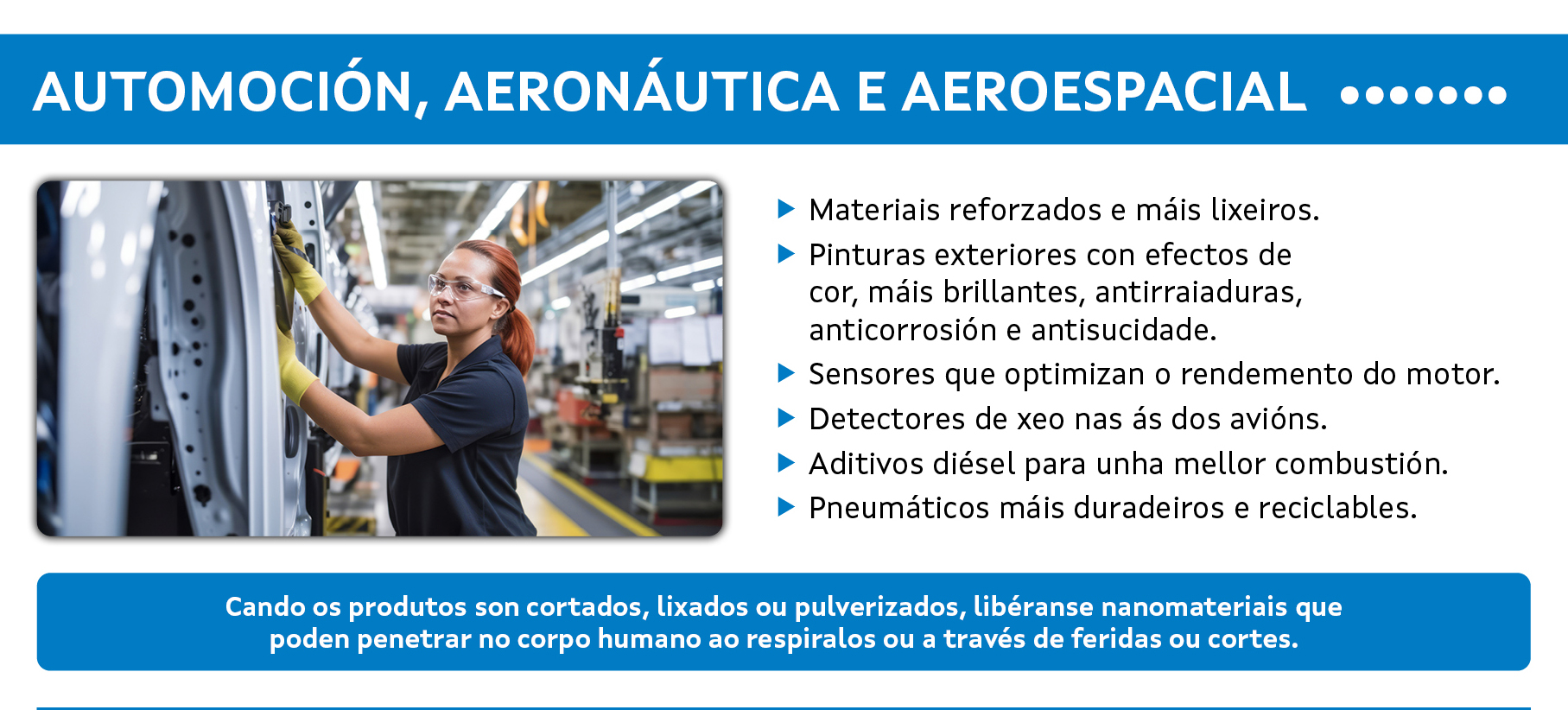 Na última década houbo un crecemento exponencial dos produtos e servizos que incorporan innovacións nanotecnolóxicas en todos os sectores. Desde o punto de vista da seguridade e saúde no traballo, atopámonos con que en todos os sectores se utilizan nanomateriais ou produtos que os conteñen.