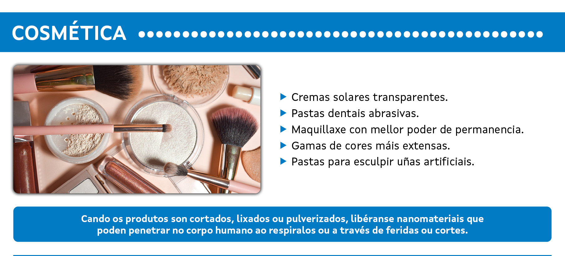 | Dióxido de titanio (TiO2) | Cremas solares, revestimentos para plásticos e metais e produtos autolimpiables, polas súas propiedades fotocatalíticas, antimicrobianas e de protección fronte a raios UV. |