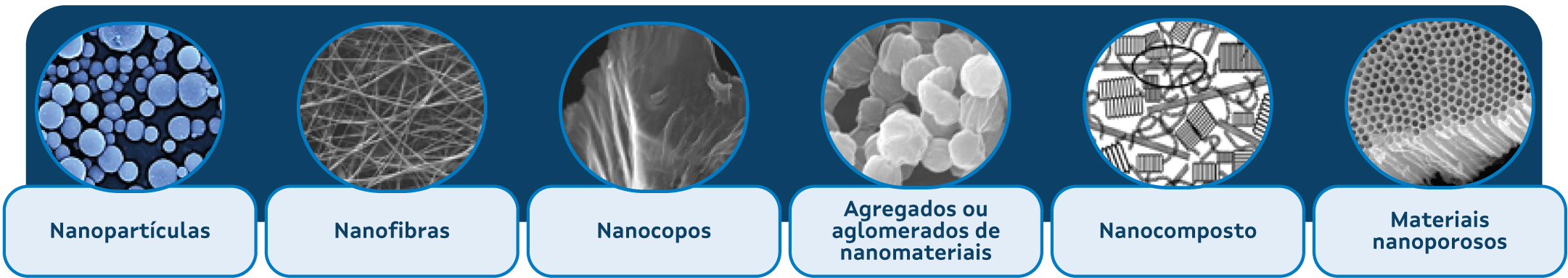 Os nanomateriais poden presentarse de forma libre, como nanobxectos ou nanopartículas individuais de diferentes formas (esférica, fibra, vara, copos etc.), ou formando parte da superficie ou integrados na composición doutros materiais (por exemplo, polímeros) ou estar na superficie ou cavidades nanoestructuradas dun material (materiais nanoestructurados, como unha esponxa).